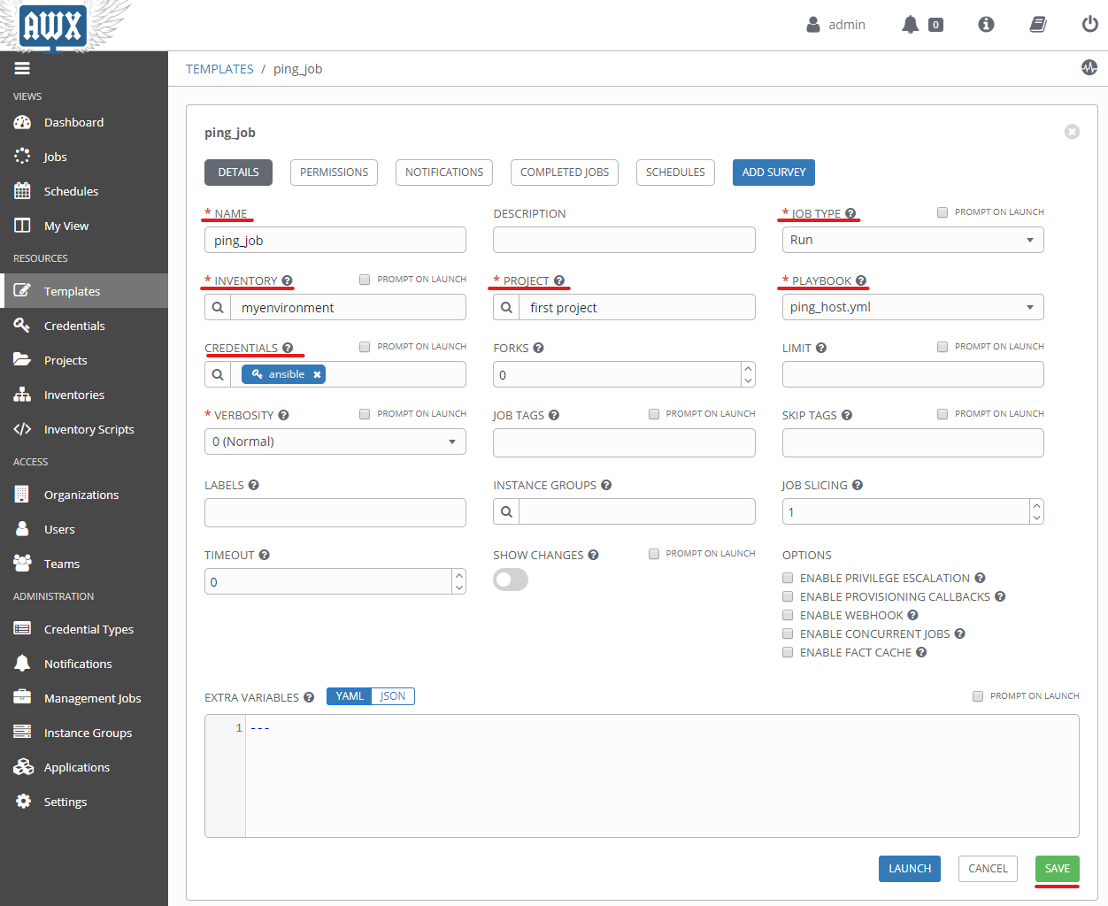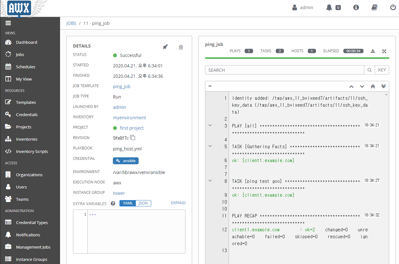 이번에는 ping을 실행하는 playbook을 등록하고 이를 ansible과 AWX를 이용해 실해하겠습니다.